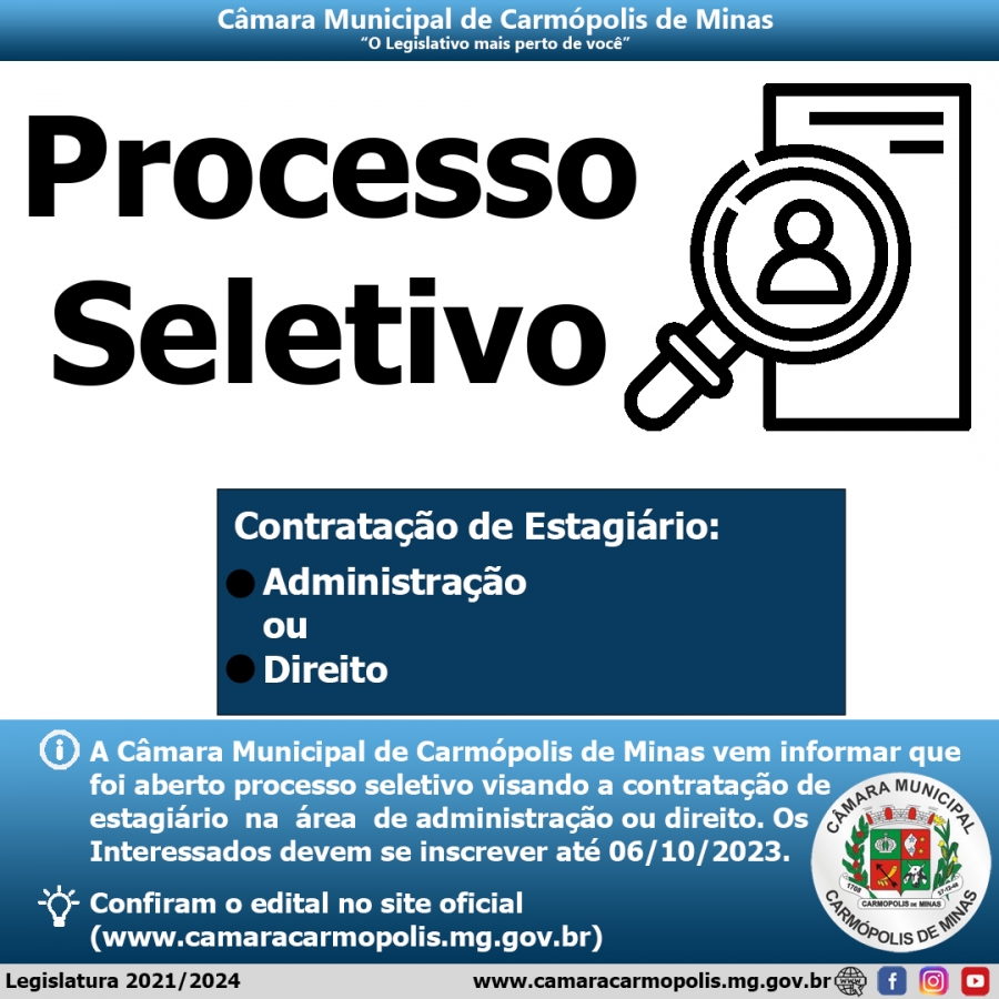 O Presidente da Câmara Municipal de Carmópolis de Minas, Estado de Minas Gerais, no uso de suas atribuições e de conformidade na legislação vigente, torna pública a abertura de inscrições de PROCESSO SELETIVO SIMPLIFICADO PARA A SELEÇÃO DE ESTAGIÁRIOS, na modalidade de estágio não obrigatório de nível superior. O presente Edital estabelece as instruções destinadas à seleção e contratação de estagiário para a área descrita no item 1.3, sob contrato de natureza administrativa, não gerando ao candidato selecionado qualquer direito como servidor público e conforme a legislação que rege a espécie.