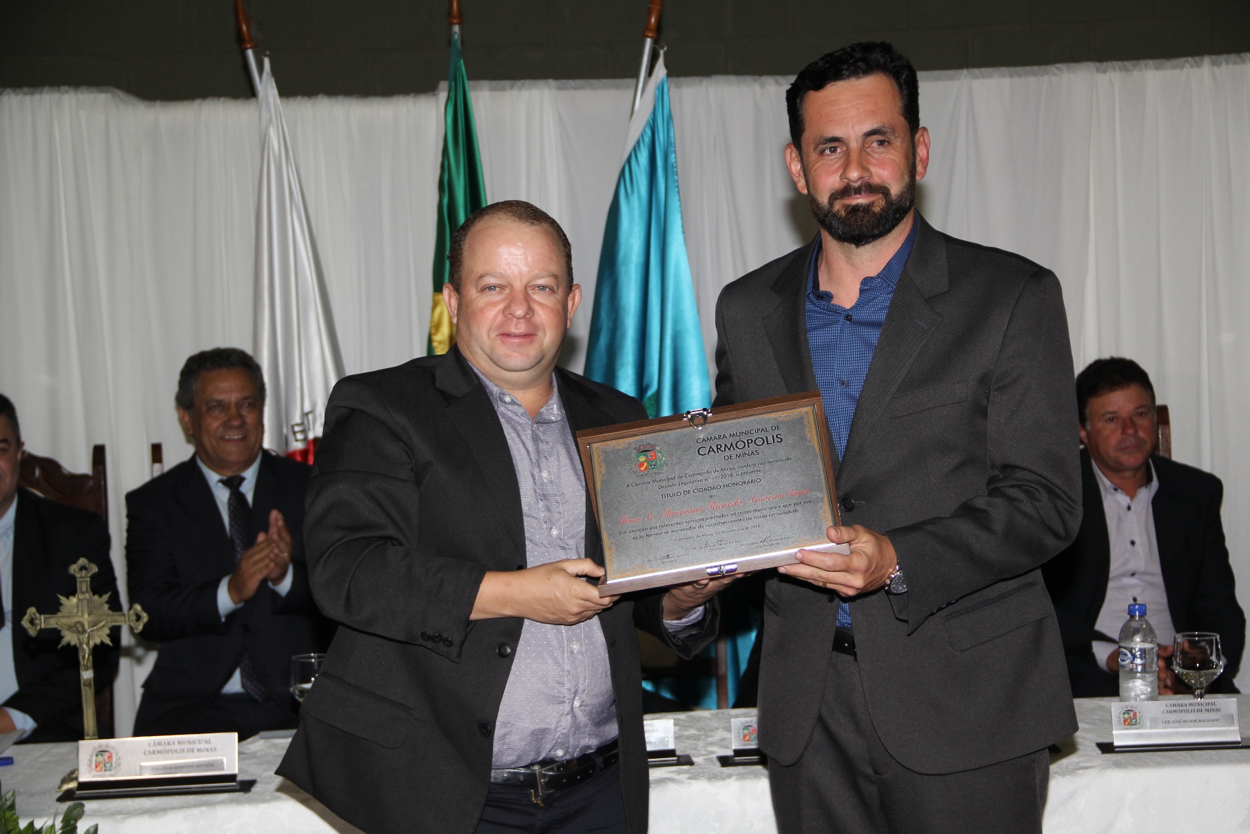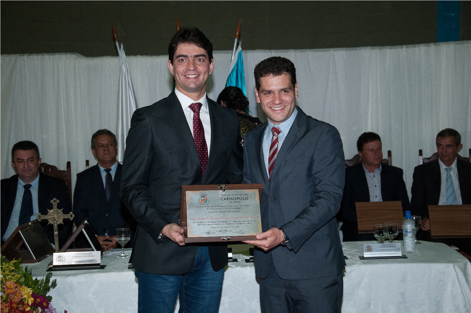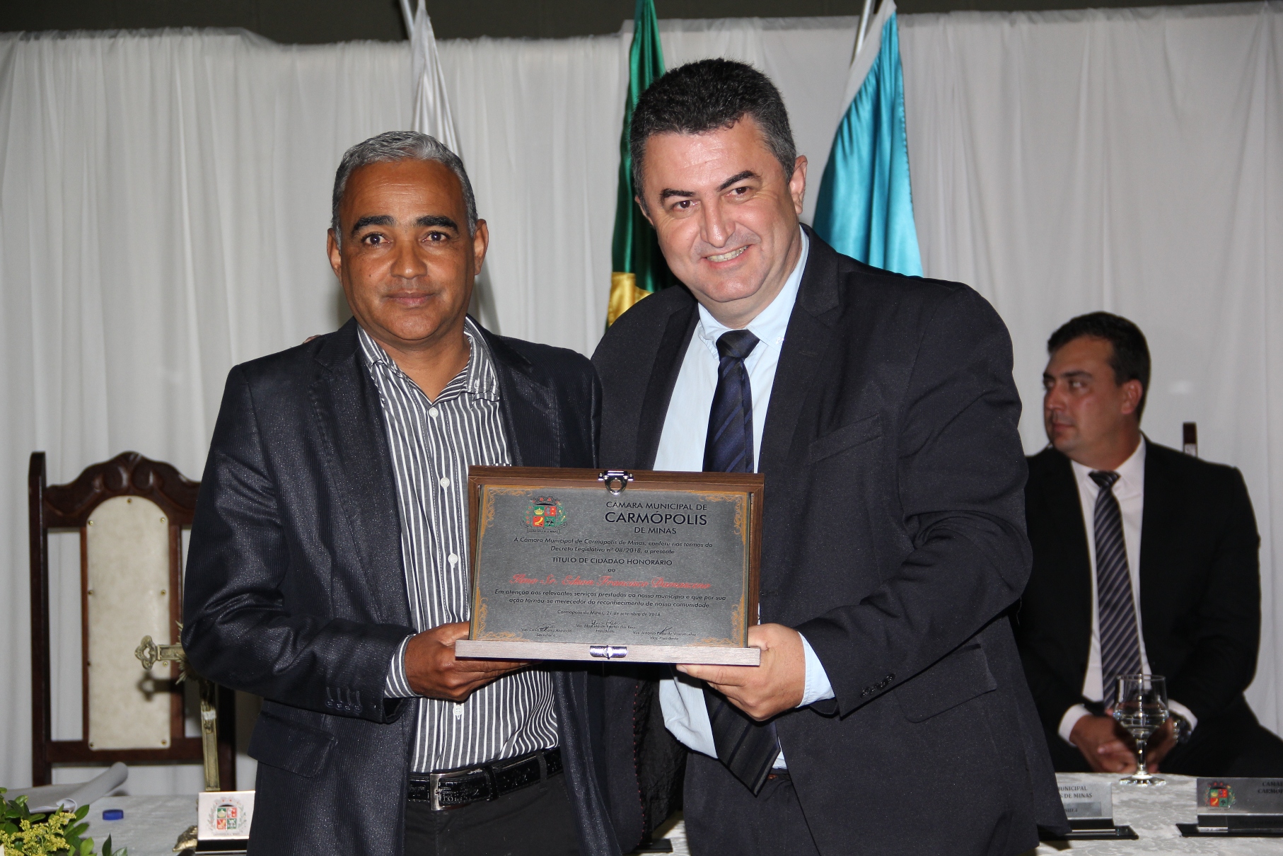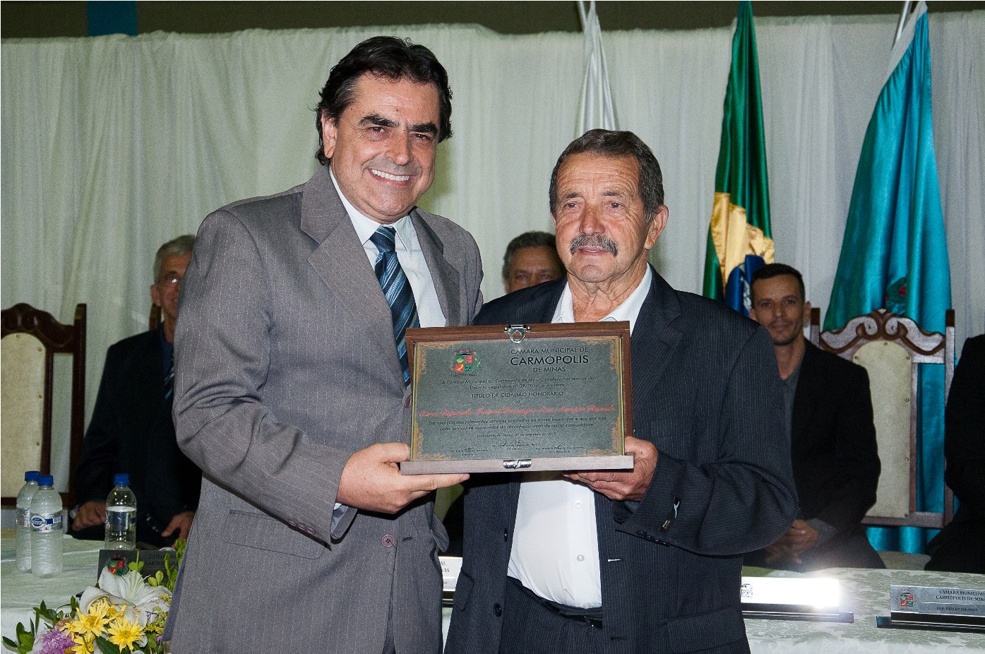 O PRESIDENTE DA CÂMARA MUNICIPAL DE CARMÓPOLIS DE MINAS, ESTADO DE MINAS GERAIS, CONCEDEU ATRAVÉS DE DECRETOS LEGISLATIVOS, TÍTULOS DE CIDADÃO HONORÁRIO A ALGUNS CIDADÃOS PELA PARTICIPAÇÃO NO DESENVOLVIMENTO E CRESCIMENTO DE CARMÓPOLIS DE MINAS.