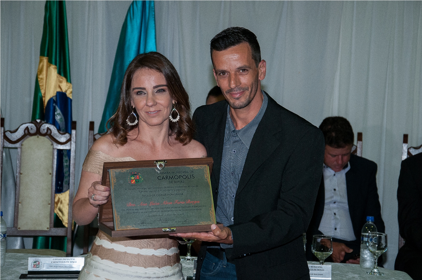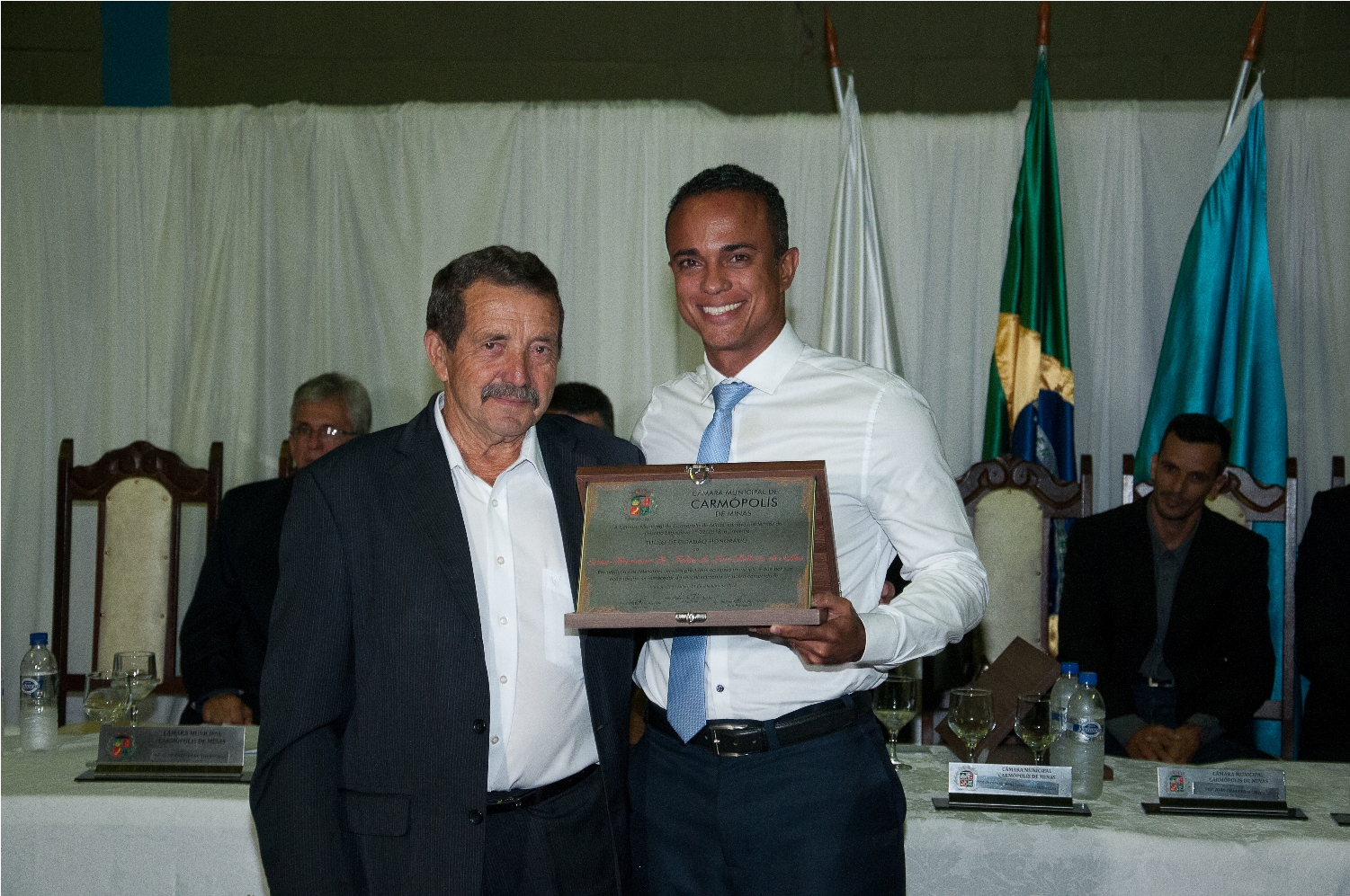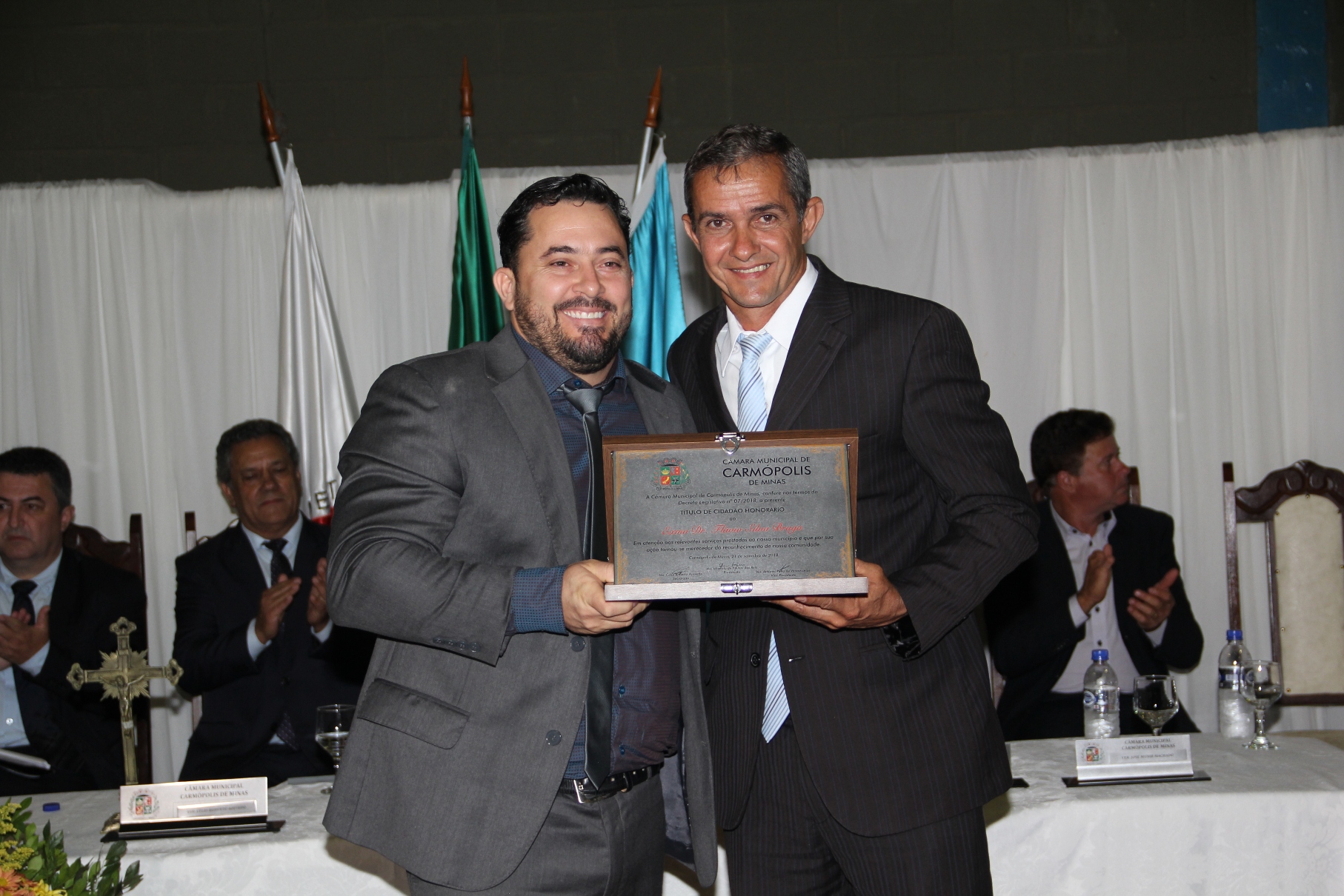 O PRESIDENTE DA CÂMARA MUNICIPAL DE CARMÓPOLIS DE MINAS, ESTADO DE MINAS GERAIS, CONCEDEU ATRAVÉS DE DECRETOS LEGISLATIVOS, TÍTULOS DE CIDADÃO HONORÁRIO A ALGUNS CIDADÃOS PELA PARTICIPAÇÃO NO DESENVOLVIMENTO E CRESCIMENTO DE CARMÓPOLIS DE MINAS.